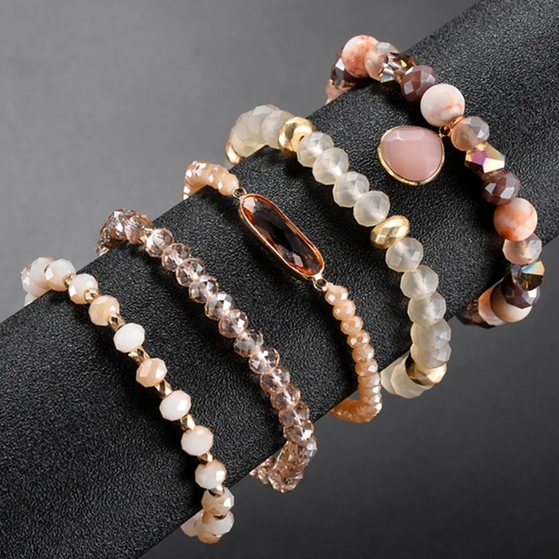New Bohemian Multilayer Bracelet Bangles Sets Natural 5Pcs Natural Crystal Stone Jewelry Stainless stee